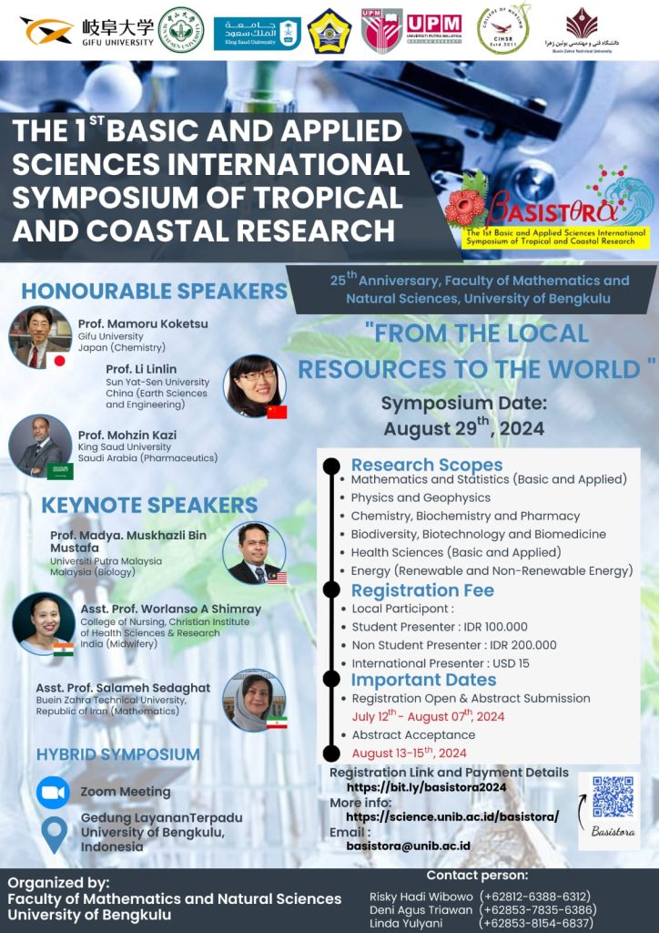 This year, Bengkulu University launched the first BASISTORA to commemorate the Faculty of Mathematics and Natural Sciences’ silver anniversary. This international symposium is a forum for researchers, lecturers, and students to disseminate the results of studies in their respective fields related to the utilization of local natural resources, especially those based on tropical wealth and coastal areas. In this first international symposium, we designed the meeting only for dissemination in the form of presentations. We hope to have more comprehensive facilities for the second BASISTORA, scheduled for 2026.