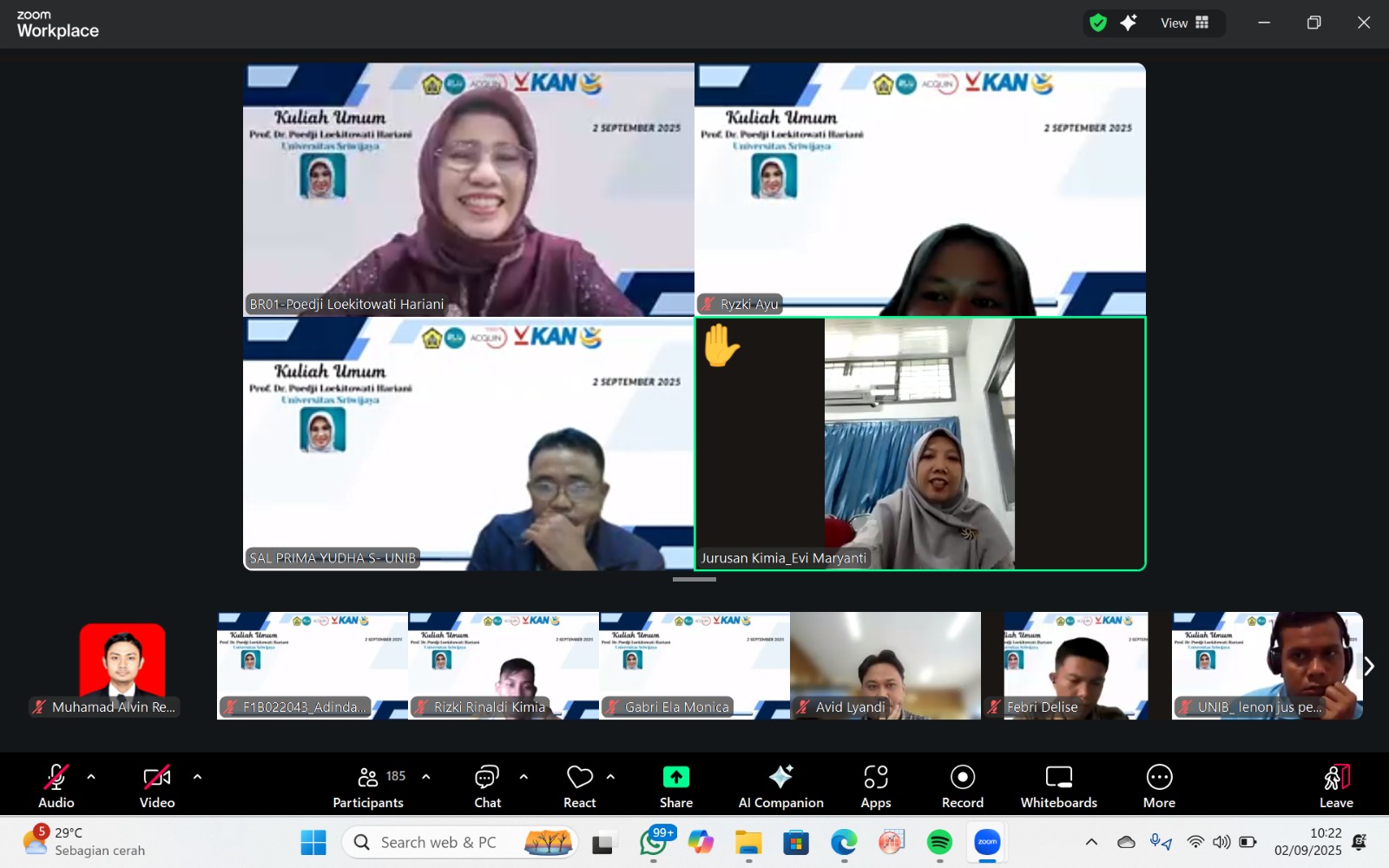 The public lecture featured Prof. Dr. Poedji Loekitowati Hariani from Sriwijaya University as the main speaker. The session took place from 09:00 to 10:30 WIB and was attended by lecturers and students of the Chemistry Undergraduate Program. The event was hosted by Prof. Dr. Sal Prima Yudha S. from the University of Bengkulu.
