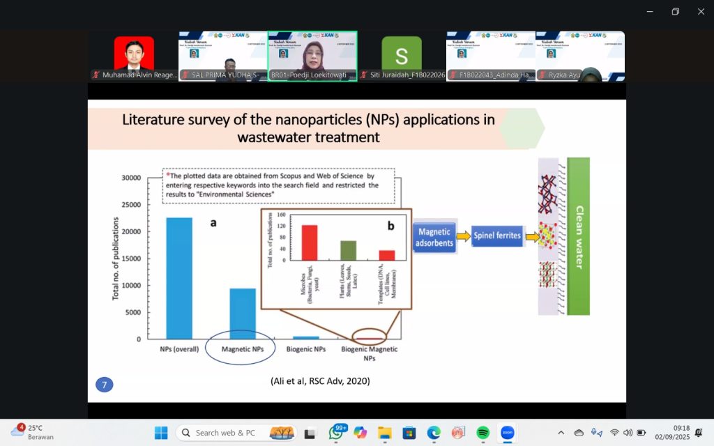 During the lecture, Prof. Dr. Poedji Loekitowati Hariani discussed the development and application of magnetic materials, particularly magnetic nanoparticles, for environmental remediation and health-related applications. The lecture highlighted the growing research trends in the use of nanoparticles for wastewater treatment, including their role as magnetic adsorbents capable of removing pollutants efficiently. The discussion also covered recent literature findings on the application of spinel ferrites and biogenic magnetic nanoparticles, emphasizing their advantages in separation processes and clean water production.