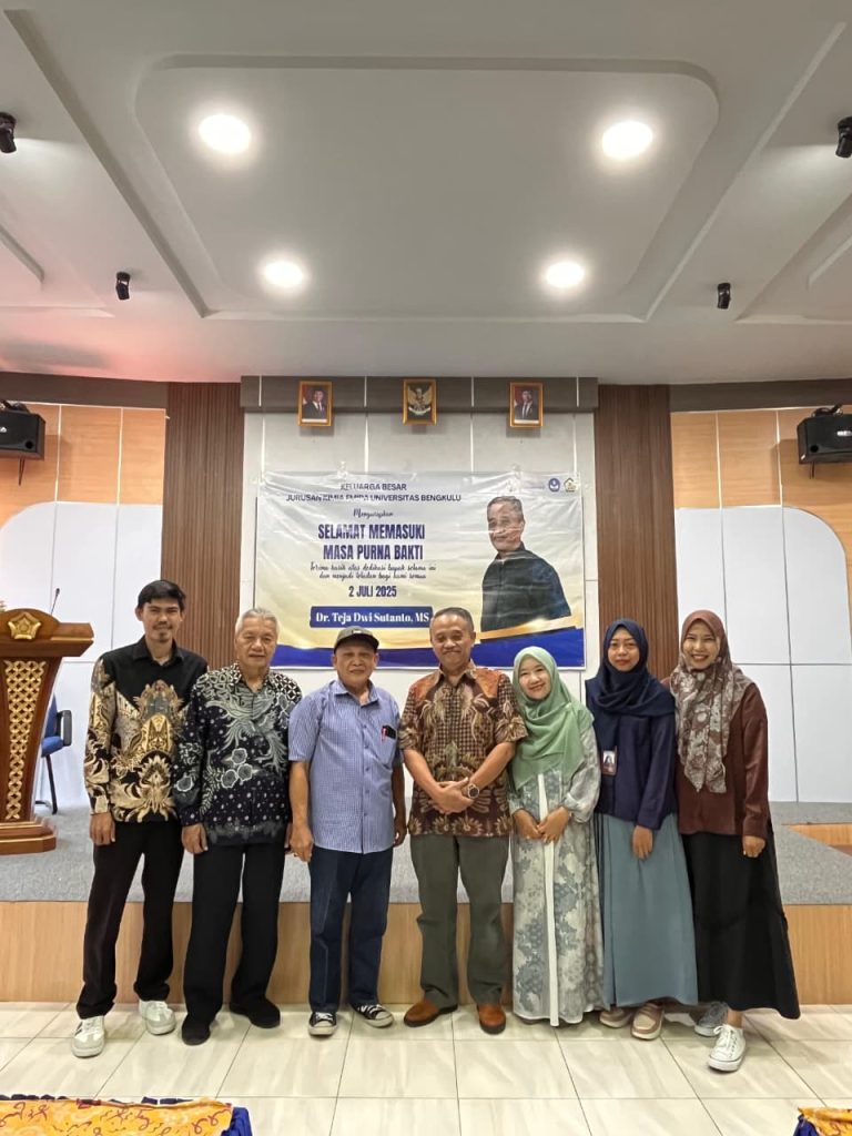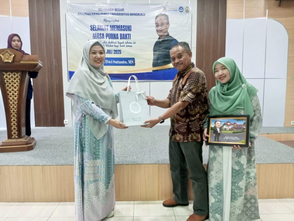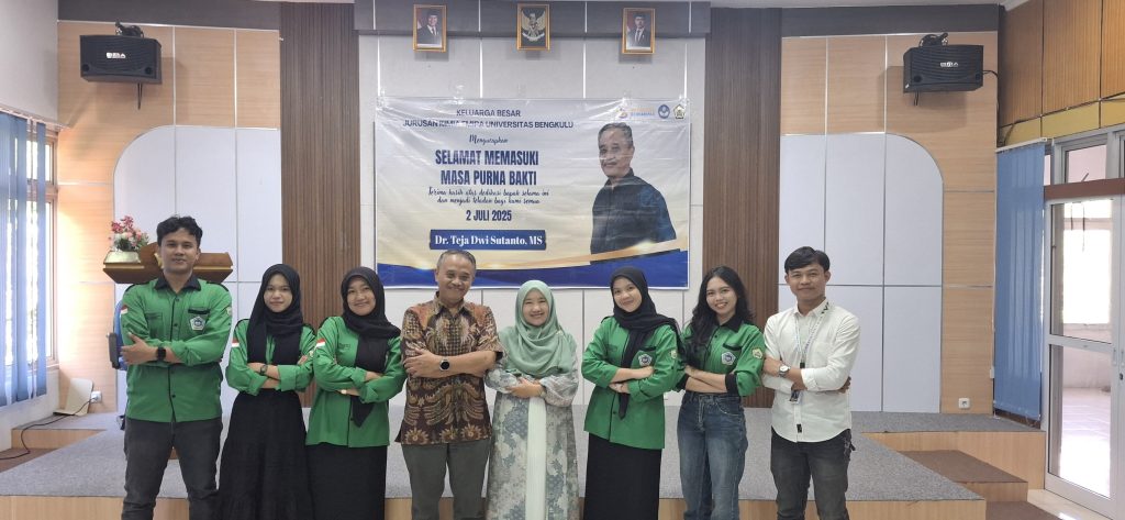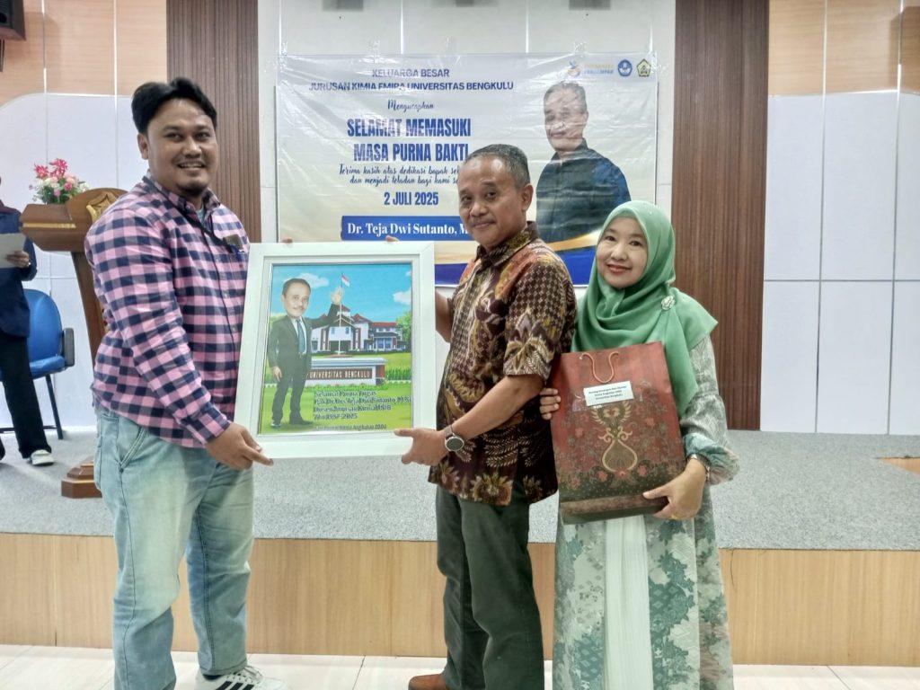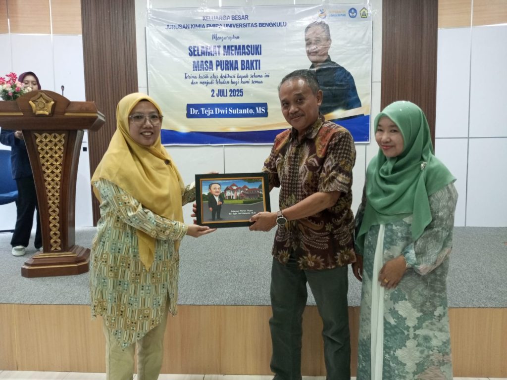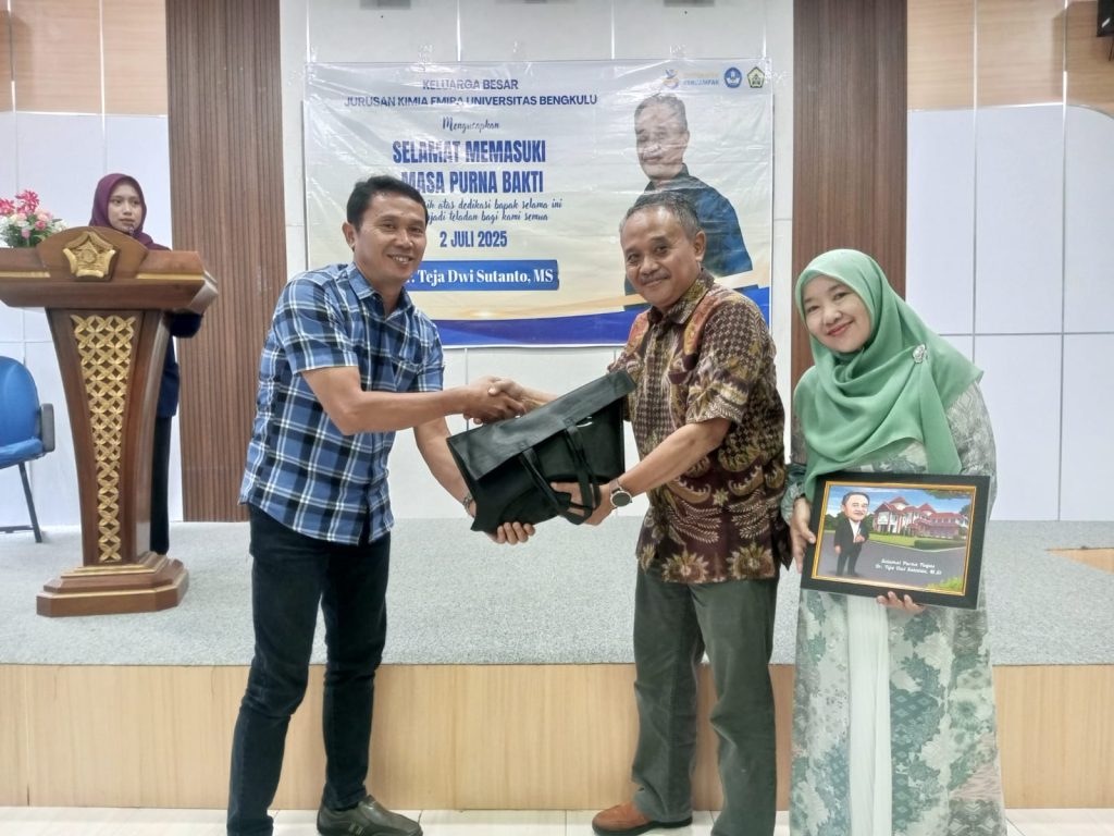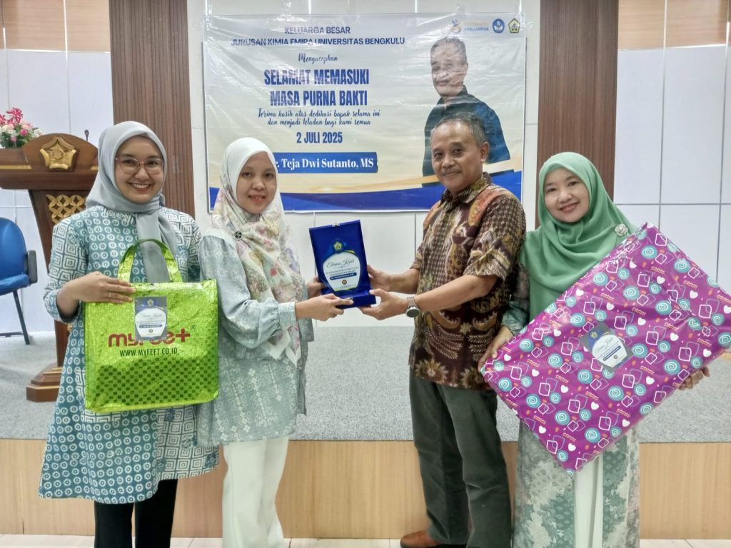 Bengkulu, 2 Juli 2025 – Program Studi S1 Kimia, Fakultas Matematika dan Ilmu Pengetahuan Alam (FMIPA) Universitas Bengkulu menyelenggarakan acara Purna Bakti bagi salah satu dosen terbaiknya, Dr. Teja Dwi Sutanto, M.S., sebagai bentuk penghormatan atas pengabdian dan dedikasi beliau selama menjalankan tugas sebagai pendidik, peneliti, dan pengabdi masyarakat.