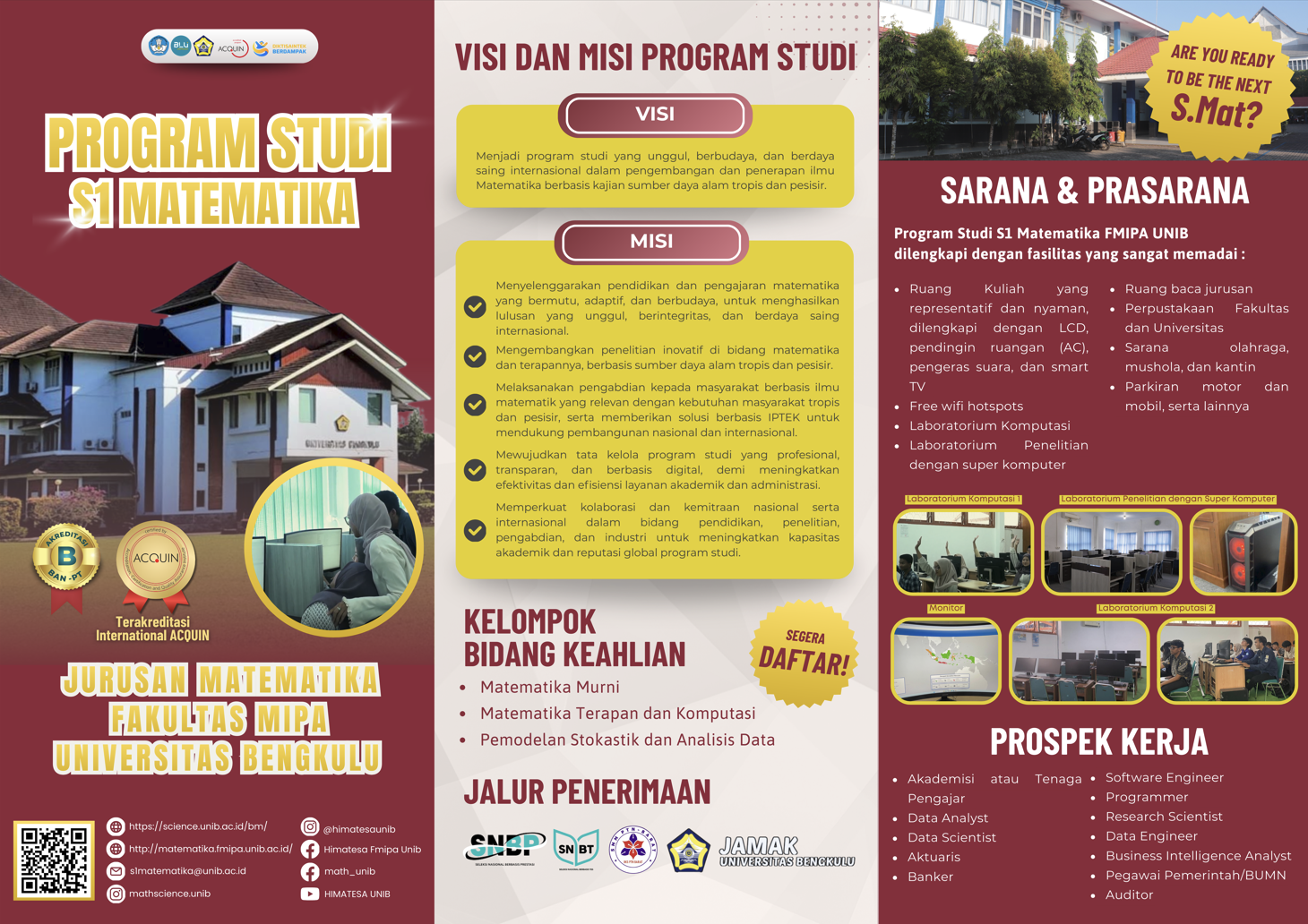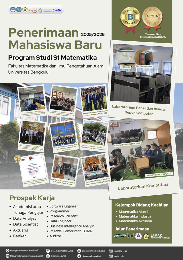 There are three admission routes in this mathematics study program, namely the test-based national selection path (called SBMPTN), the talent-based national selection path (called SNMPTN), and the local selection path (called SMMPTN). All these tests are held annually, you can repeat the test if you fail this year.