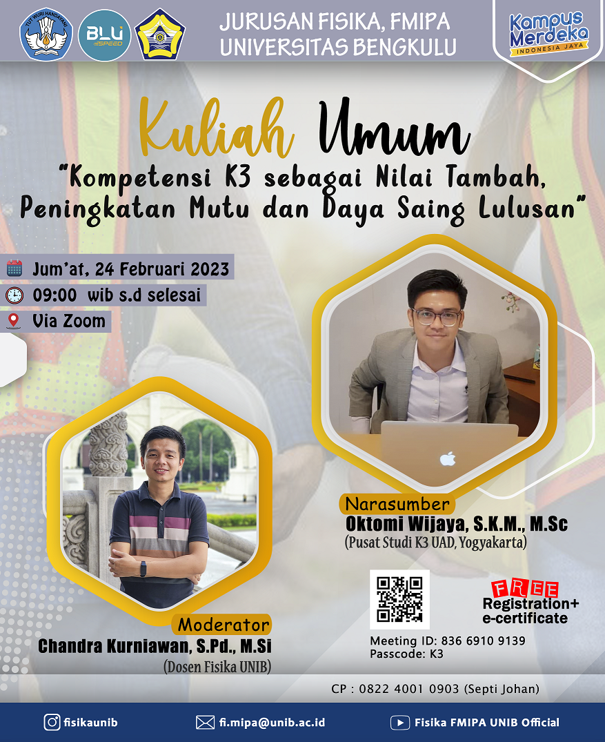 General lectures are routine activities held by the Physics Study Program, Department of Physics FMIPA, University of Bengkulu. At the inaugural general lecture in 2023, this activity was held on Friday, February 24, 2023. This public lecture was themed ” Occupational Health and Safety Competence for Quality and Competitiveness of Graduates” with Keynote Speaker Mr. Oktomi Wijaya S.K.M., M.Sc. from Occupational Health and Safety Study Center, the Ahmad Dahlan University, Yogyakarta. This activity was carried out online using Zoom video meetings.
