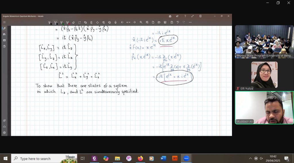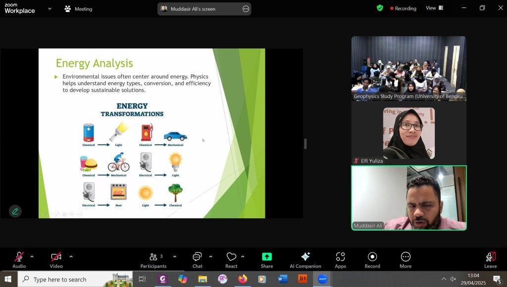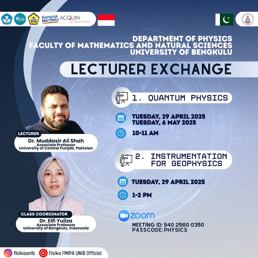 The lecturer exchange program was conducted as part of an academic collaboration aimed at enhancing teaching quality, expanding research networks, and promoting knowledge sharing between institutions. Therefore, in this even semester (2025), Physics Study Program was joined lecturer exchange activities initiated by Dean of Faculty of Mathematics and Natural Sciences, University of Bengkulu, Prof. Dr. Sal Prima Yudha with University of Central Punjab, Pakistan. In This activities, Physics Study Program, was represented by Dr. Elfi Yuliza. While, the partner from University of Central Punjab is Dr. Muddasir Ali Shah.