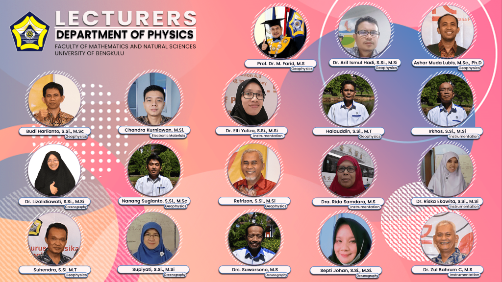 Lecturers of Physics Study Program Prof. Dr. M. Farid, M.S. Refrizon, S.Si., M.Si. Dra. Rida Samdara, M.S. Supiyati, S.Si., M.Si. Halauddin, S.Si., M.T. Septi Johan, S.Si., M.Si. Prof. Ashar Muda Lubis, S.Si., M.Sc., Ph.D Dr. Liza Lidiawati, S.Si., M.Si. Dr. Riska Ekawita, S.Si., M.Si. Suhendra, S.Si., M.T. Irkhos, S.Si., M.Si. Chandra Kurniawan, S.Pd., M.Si. Dr. Arif Ismul Hadi, S.Si., M.Si., Dr. Elfi Yuliza, S.Si., M.Si. Drs. Suwarsono, M.S. Dr. Zul Bahrum Caniago, M.S Nanang Sugianto, S.Si., M.Sc. Budi Harlianto, S.Si., M.Sc.