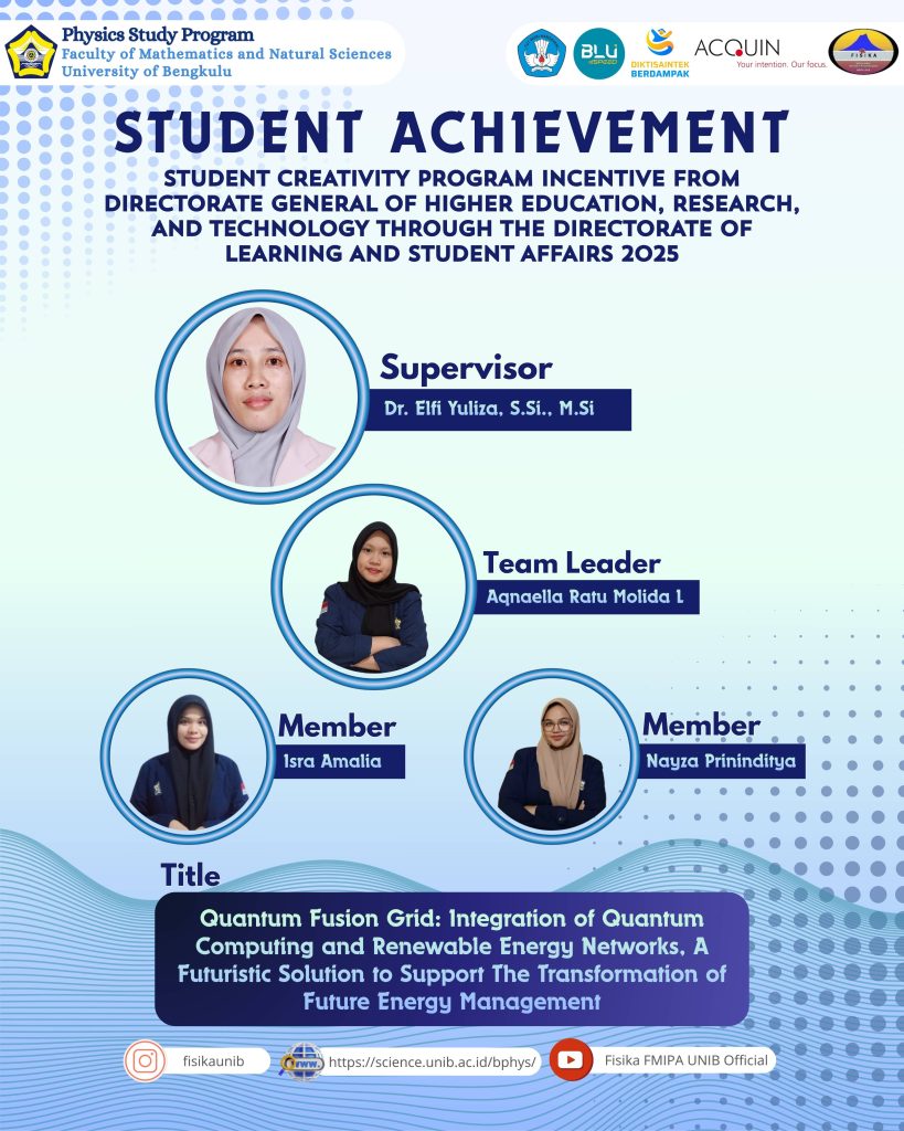 Meanwhile, the PKM-GFT funding was obtained by a team led by Aqnaela Ratu with the title “Quantum Fusion Grid: Integration of Quantum Computing and Renewable Energy Networks as a Futuristic Solution to Support the Transformation of Future Energy Management.” This futuristic concept proposes the integration of quantum computing and renewable energy networks as an innovative approach to managing future energy systems.