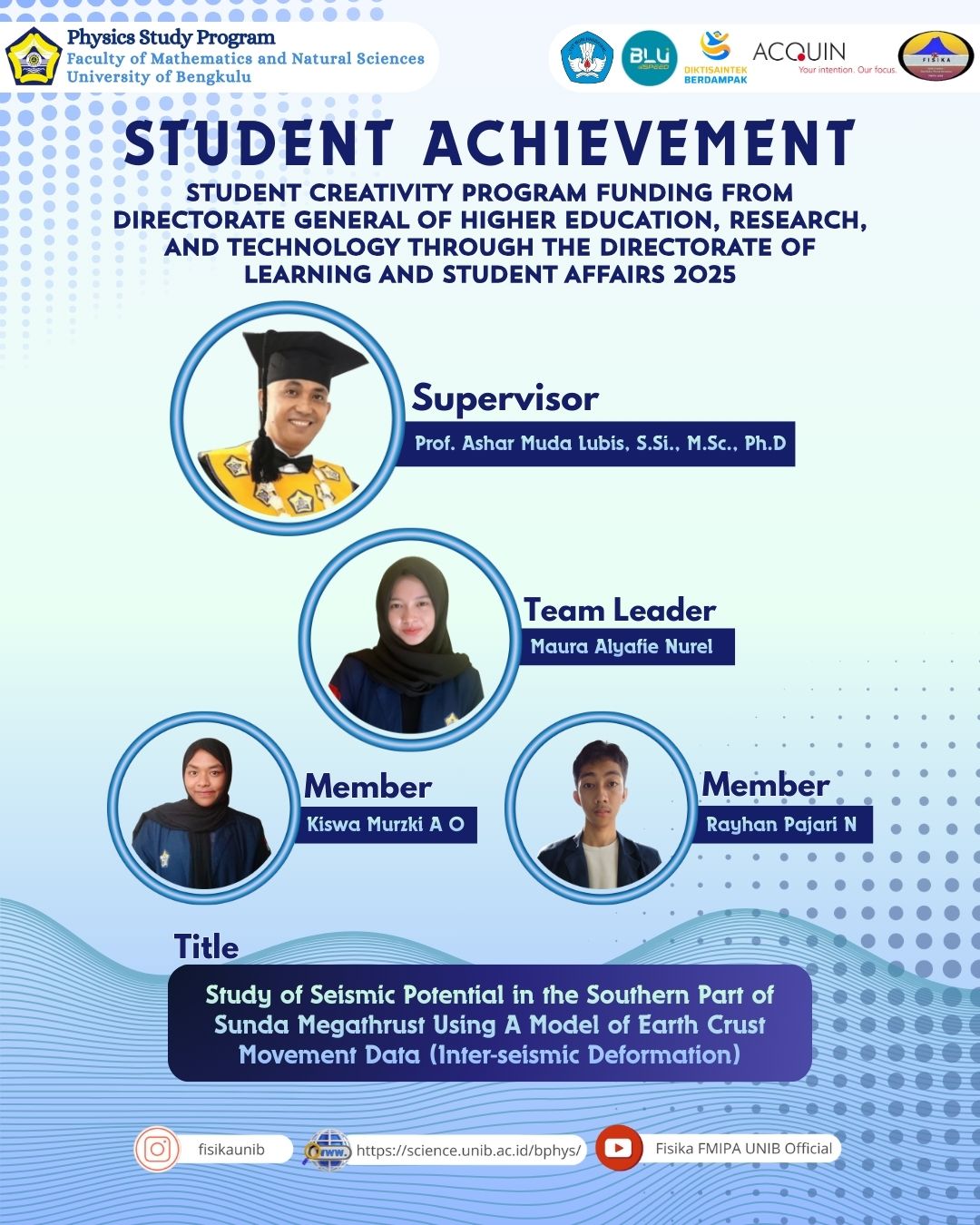 The PKM-RE funding was awarded to a team led by Maura Alyafie Nurel for their research entitled “Study of Seismic Potential in the Southern Part of the Sunda Megathrust Using a Model of Earth Crust Movement Data (Inter-Seismic Deformation).” This study focuses on assessing seismic potential in the southern region of the Sunda Megathrust through the modeling of earth crust movement data, contributing scientifically to efforts in earthquake hazard mitigation.