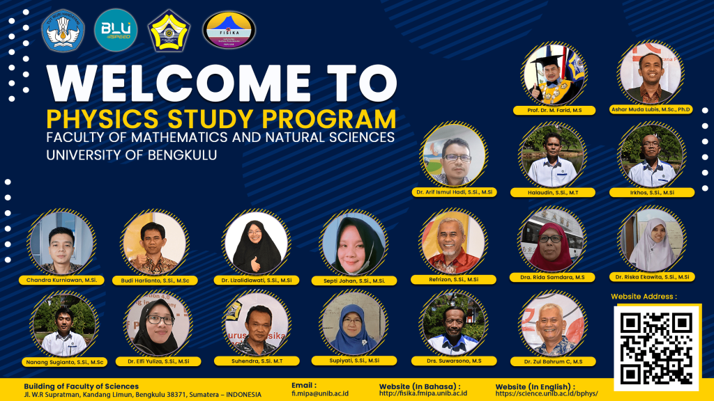 The Physics study program is one of the four study programs established at the beginning of the establishment of the Faculty of Mathematics and Natural Sciences, Bengkulu University. This faculty was ratified based on the decree of the Minister of Education and Culture of the Republic of Indonesia number 195/O/1999 of August 10, 1999. The Physics study program was opened on the basis of a permit from the Director General of Higher Education number: 2293/D/T/2001 of July 4, 2001. Since then, it has been accepting students.