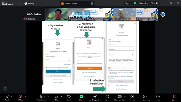 Materi ketiga disampaikan oleh Firdaus, S.Si., M.Stat. melalui platform Zoom Meeting, berupa pelatihan penggunaan aplikasi Mendeley dalam penulisan skripsi. Pada sesi ini, mahasiswa dibekali pemahaman mengenai pengelolaan referensi, penyisipan sitasi otomatis, serta penyusunan daftar pustaka sesuai dengan gaya penulisan yang ditetapkan. Meskipun disampaikan secara daring, pelatihan berlangsung interaktif dan terintegrasi dengan kegiatan luring di laboratorium.