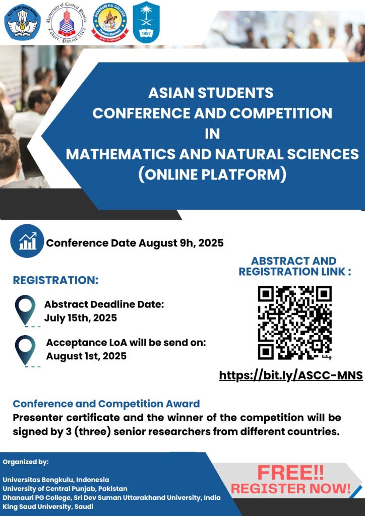 Call for Asian Students Conference and Competition in Mathematics and Natural sciences (online Platforms) JOIN THIS EVENT Start July 15, 2025 End August 9, 2025 Address Online platform View map + GOOGLE CALENDAR + ICAL IMPORT MORE DETAIL Website https://bit.ly/ASCC-MNS Call for Asian Students Conference and Competition in Mathematics and Natural sciences (online Platforms) BUY NOW Cancel reply Your comment ... Leave a Reply Cancel replyYour email address will not be published. Required fields are marked *Comment * Save my name, email, and website in this browser for the next time I comment.