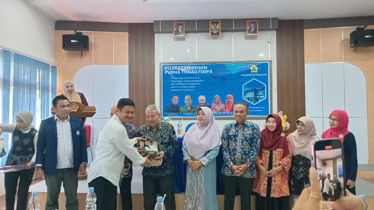 The Faculty of Mathematics and Natural Sciences (FMIPA) of the University of Bengkulu held a farewell ceremony for the 2025 retirement of lecturers, along with awards and appreciation for the dedication of lecturers within the FMIPA who will retire in 2025 on Monday, January 26, 2026. The event took place in the FMIPA Meeting Room, amidst a solemn and friendly atmosphere.