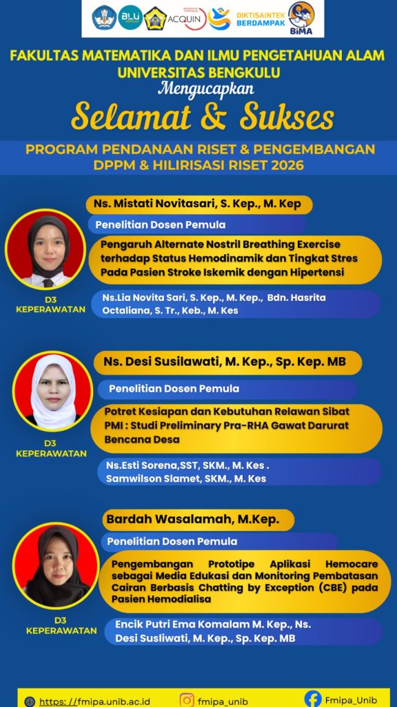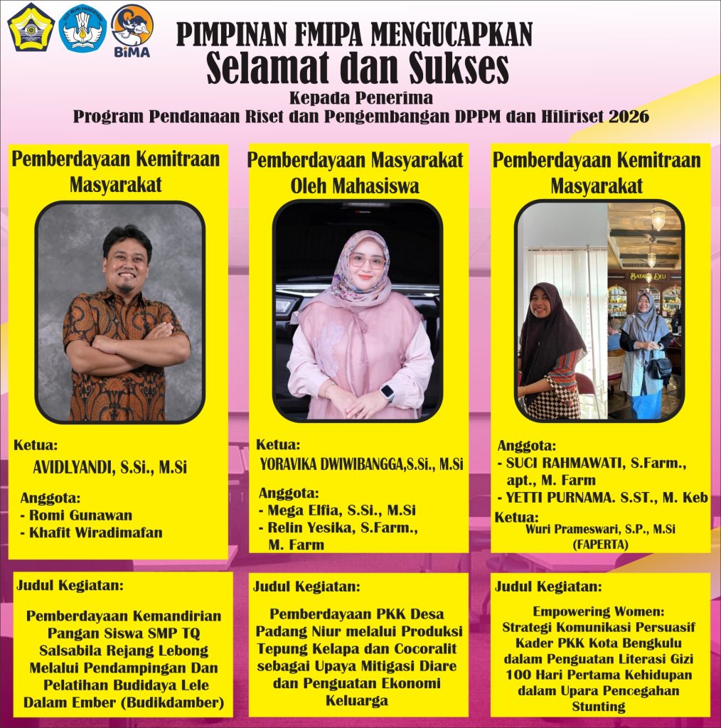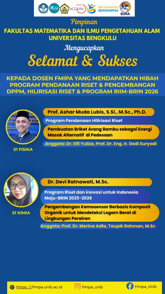 Pimpinan Fakultas MIPA menyampaikan ucapan selamat dan apresiasi yang setinggi-tingginya kepada para dosen yang berhasil meraih pendanaan dalam berbagai program riset nasional tahun 2026. Program tersebut meliputi Hibah Program Pendanaan Riset & Pengembangan DPPM, Hibah Hilirisasi Riset, serta Program RIIM-BRIN.