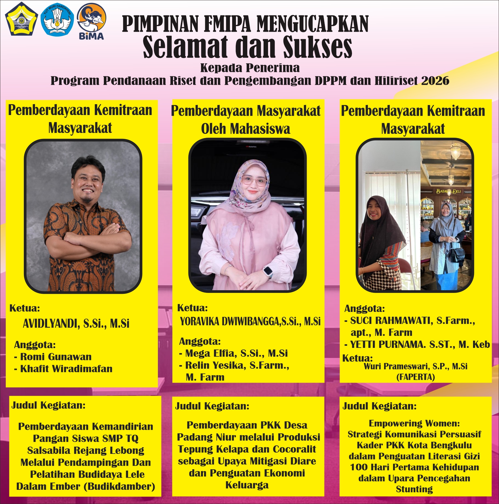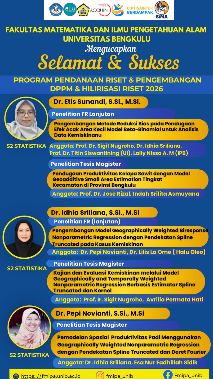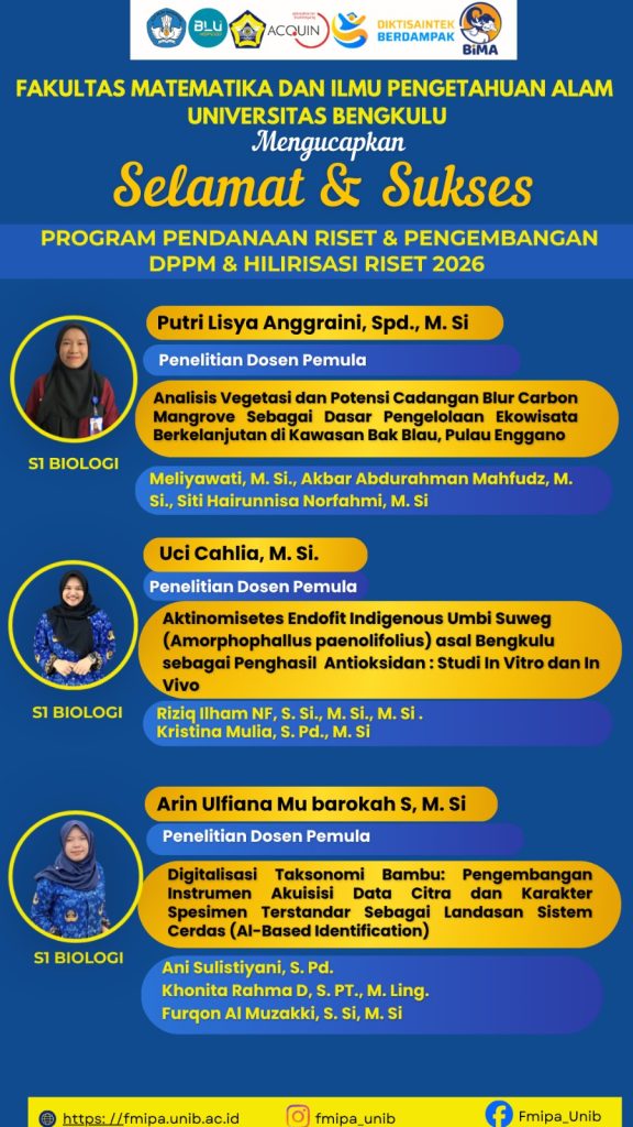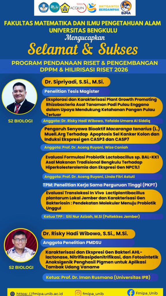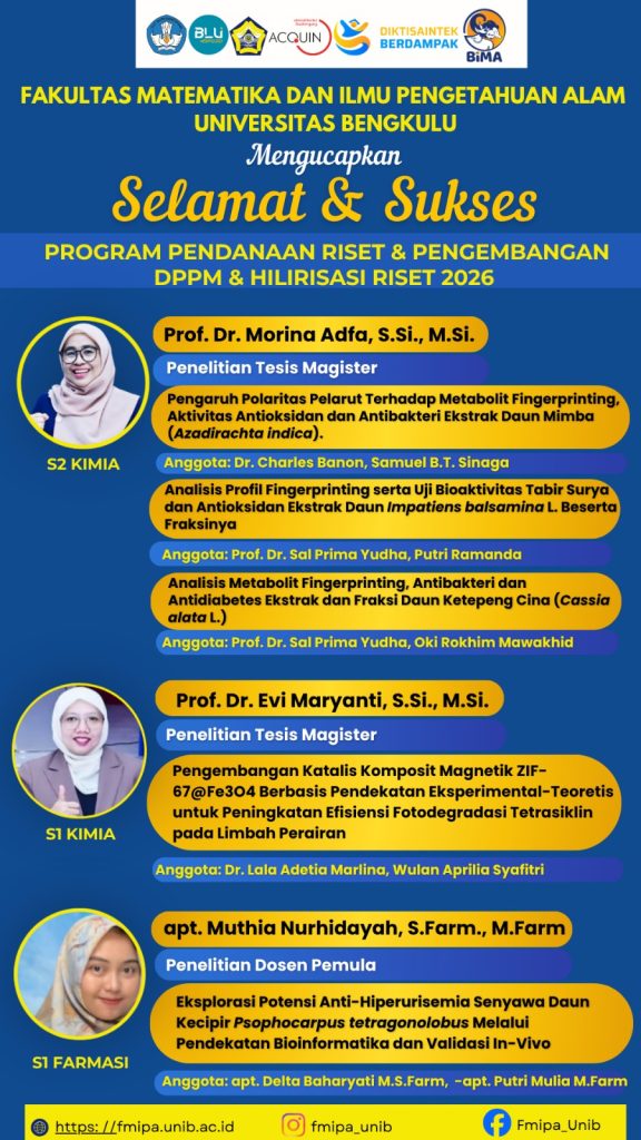 Selamat & Sukses Kepada Dosen FMIPA yang Mendapatkan Hibah Program Pendanaan Riset & Pengembangan DPPM, Hilirisasi Riset & Program RIIM-BRIN 2026