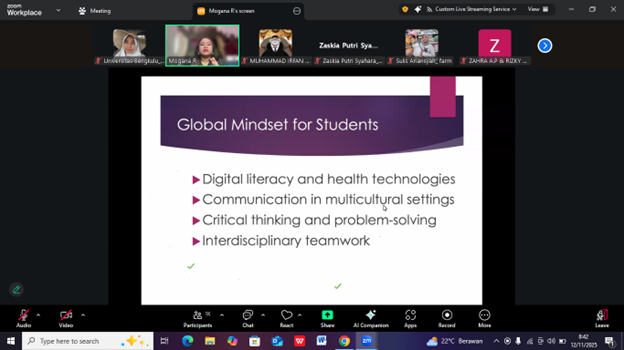 Agenda webinar dimulai pada pukul 08.00 WIB secara daring melalui platform Zoom Meeting dan Youtube. Kegiatan ini dibuka oleh moderator dari Poltekkes Kemenkes Tasikmalaya, apt. Nooryza Martihandini, M.Farm. Dilanjutkan dengan pemaparan materi oleh narasumber dari UCSI Malaysia, Prof. Dr. Mogana Sundari Rajagopal. Webinar ini membahas tren dan tantangan kesehatan global di era post-pandemic, peran strategis tenaga farmasi dalam mendukung sistem kesehatan global, transformasi digital dalam praktik farmasi (telepharmacy, health informatics, AI), dan penguatan kompetensi mahasiswa vokasi farmasi: soft skills, bahasa asing, penelitian terapan, dan komunikasi interprofesional, serta peluang karir global bagi lulusan vokasi farmasi.